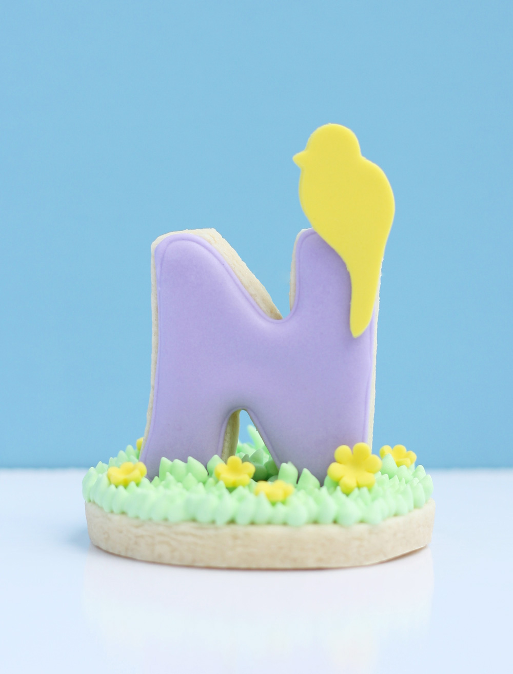 Once your grass has dried you can add your gum paste decorations. Pipe a small amount of royal icing to the back of the decorations so that you can stick them to the grass and the letters. I spread the flowers around and I also did little clusters of flowers together. Here is a close up of one of my favorite letters!